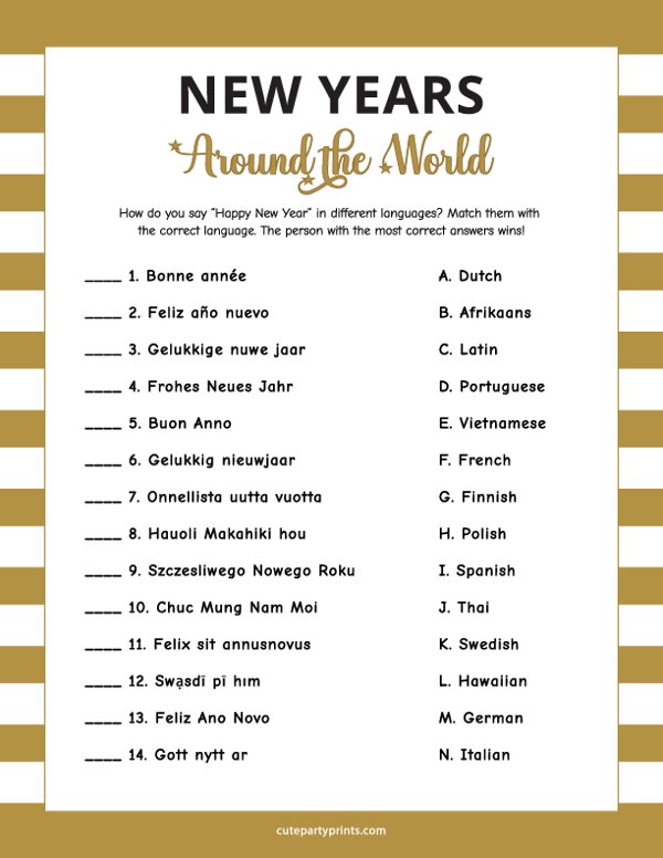 - Get your free printable game sheet with a list of languages and their jumbled "Happy New Year" translations.